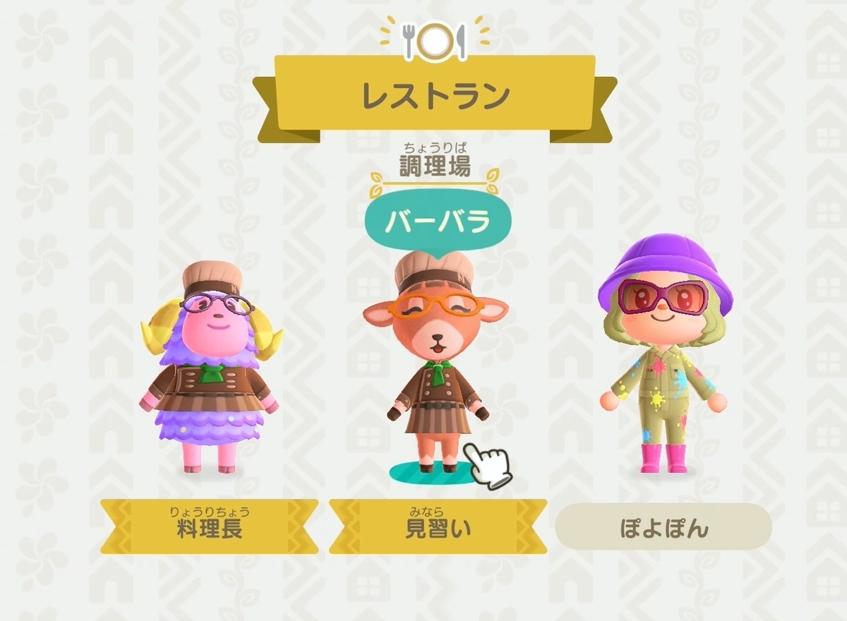 ハッピーホームパラダイスのレストラン調理場メンバーを変更しました。料理長がアネッサからエトワールに!見習いにはバーバラに入ってもらいました。